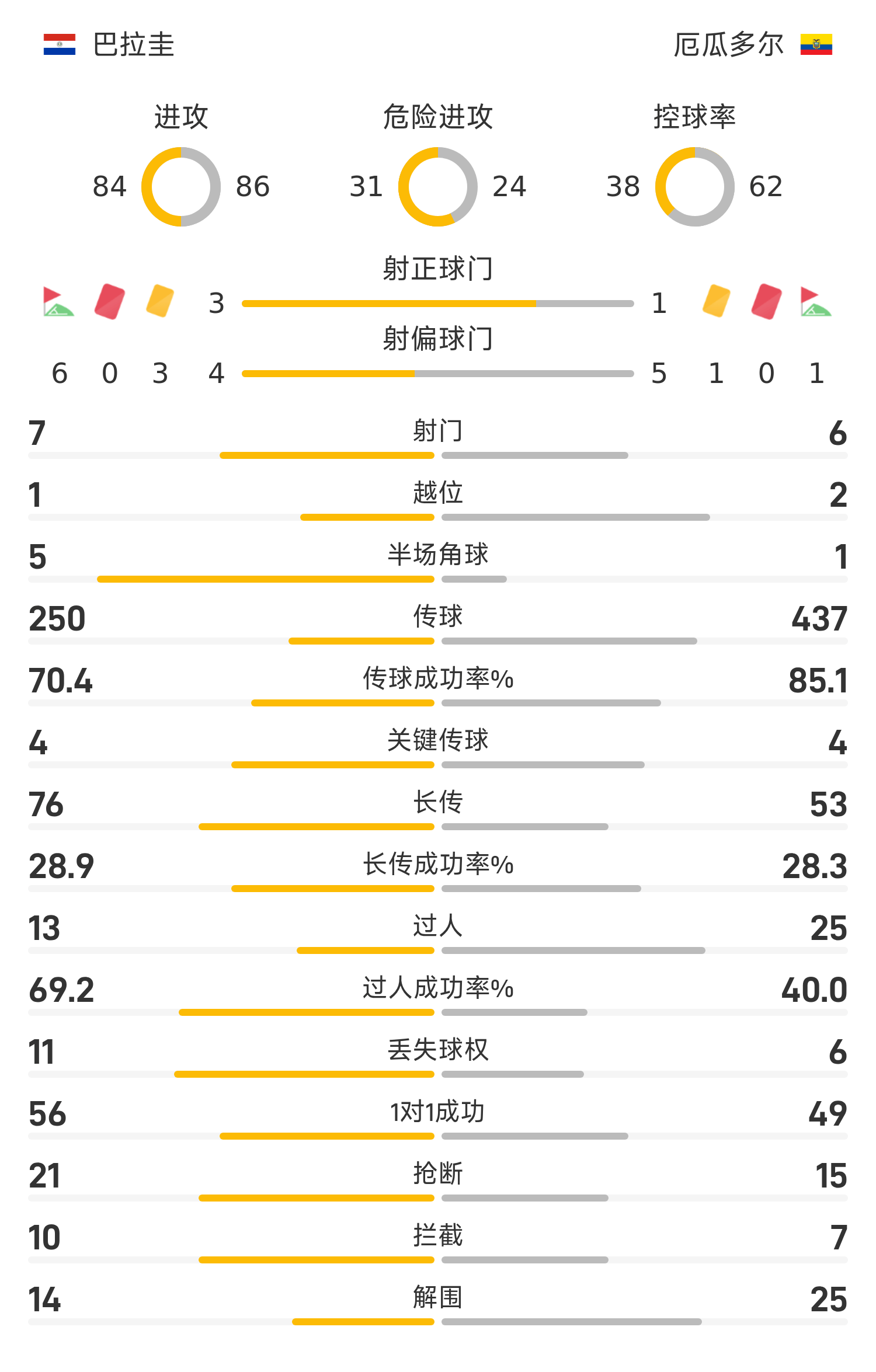 厄瓜多尔首发阵容:1-加林德斯、7-埃斯图皮尼安(85’2-托雷斯)、6-帕乔、3-因卡皮耶、4-奥多涅斯、17-普雷西亚多、5-阿尔西瓦、15-维特(90’16-梅尔卡多)、20-安戈洛(85’14-米恩达)、10-派兹(70’19-普拉塔)、13-瓦伦西亚(70’11-罗德里格斯)