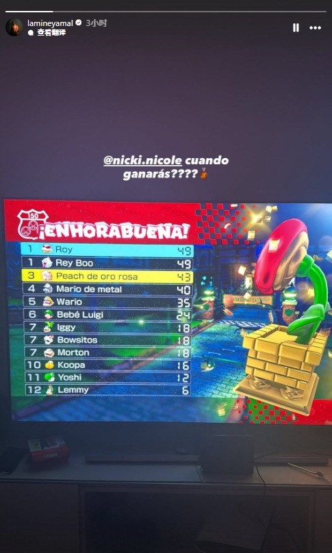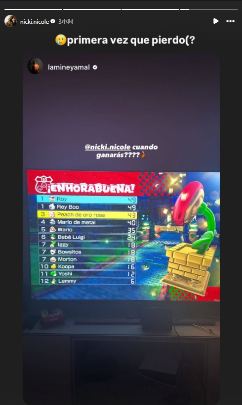 08月22日讯 今日亚马尔更新个人ins快拍晒出玩马里奥赛车游戏的图,同时艾特绯闻女友尼基-妮可,并写道:你什么时候能赢????